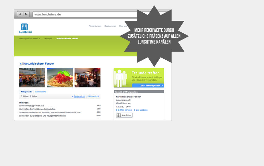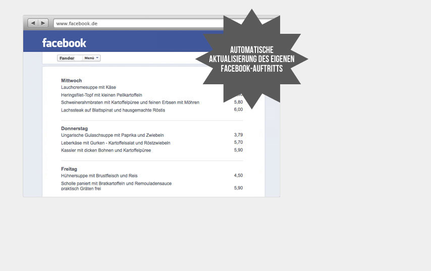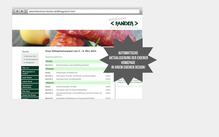 und als Werbeflyer ausdrucken. Gleichzeitig wird Ihr eigener Internet- und Facebook-Auftritt automatisch aktualisiert. Auch das Mittagstischportal Lunchtime wird automatisch mit Ihren aktuellen Angebot befüllt. So sparen Sie sehr viel Arbeitszeit und erhöhen Ihre Präsenz beim Kunden.